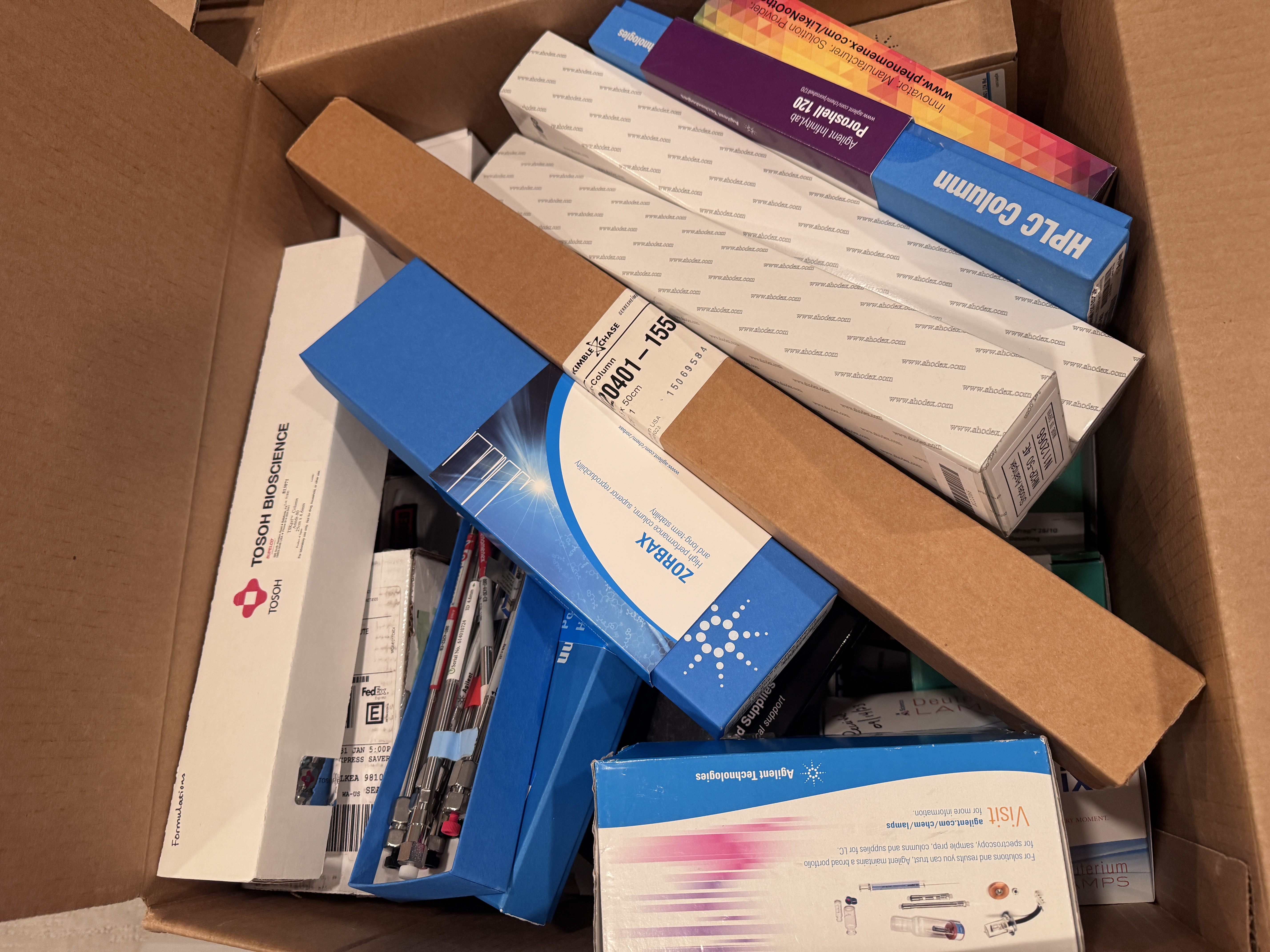 该箱色谱柱包含多种规格和填料的色谱柱,可能涵盖反相色谱柱(如C18、C8)、正相色谱柱、离子交换色谱柱或亲水作用色谱柱(HILIC)等,适用于不同极性和性质的化合物分析。安捷伦色谱柱采用高纯度硅胶基质和先进的键合技术,确保高柱效、低柱压和长寿命,同时减少分析过程中的峰拖尾现象,提高分离度。